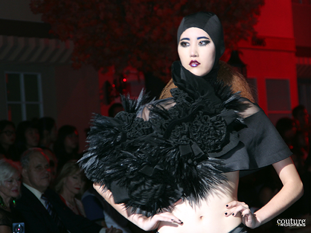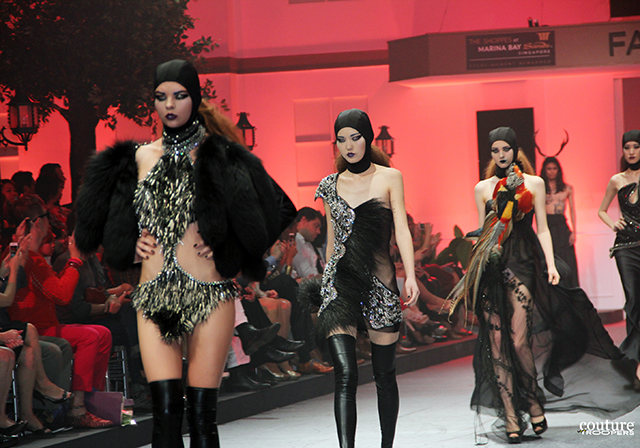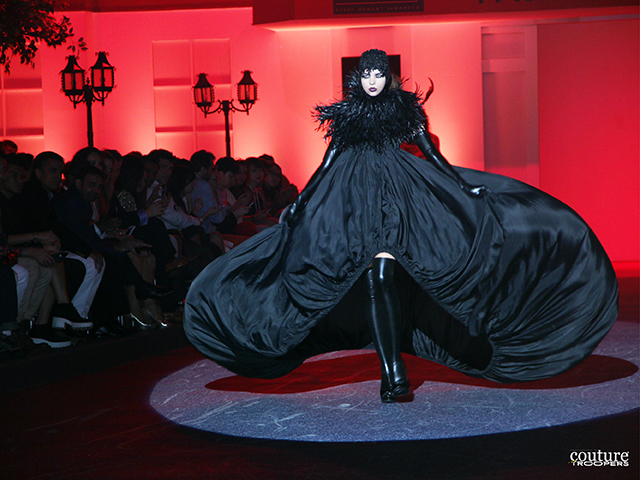 What happened though, was a glorious sightings of majestic gowns after gowns. It was like a gothic fantasy, where one’s inner dark side is channeled with bold spectrums of black, luscious fur, feathers fixed and trickled with luxe diamante and exquisite rhinestones.