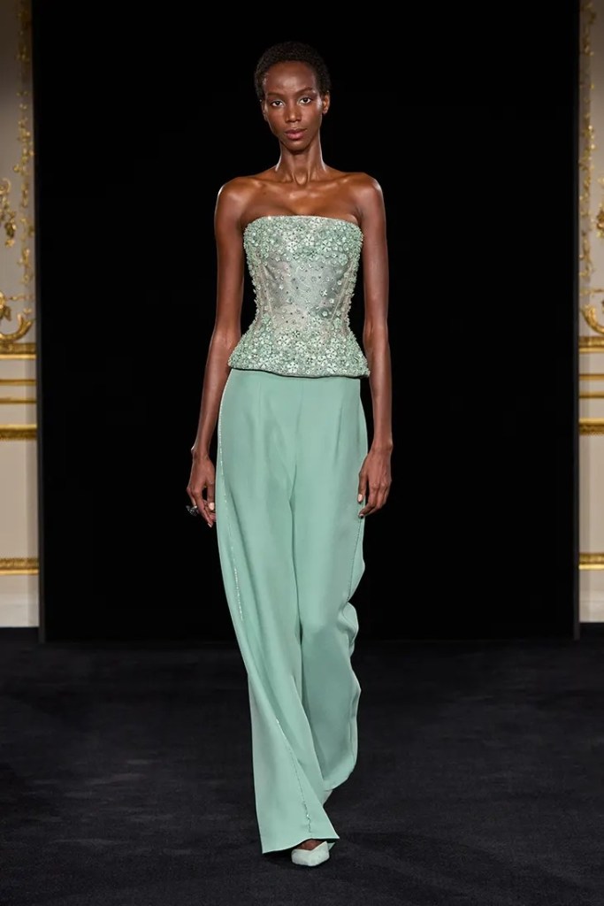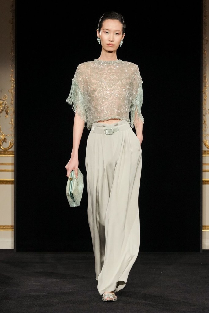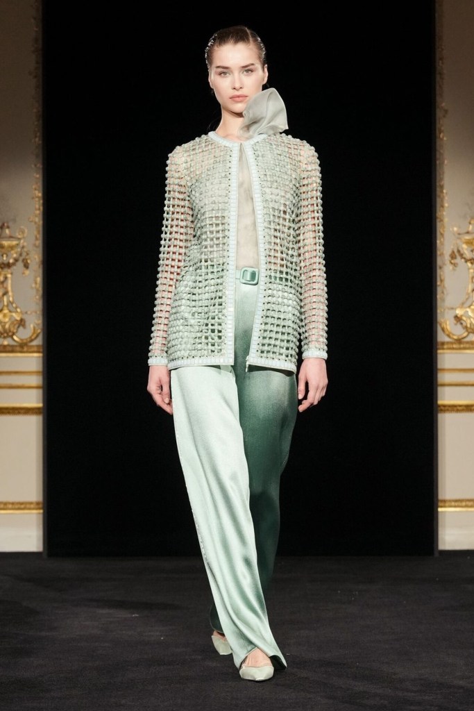 Silvana’s approach is a fascinating evolution of the house codes we have tracked since the inception of Couture Troopers. Where Giorgio was the architect of the rigid, structured power suit, Silvana has introduced a fluidity that feels almost organic. The Jade collection is built on a foundation of petal-inspired construction. We see organza ties that float away from the body and pleats that mimic the delicate veins of a leaf.